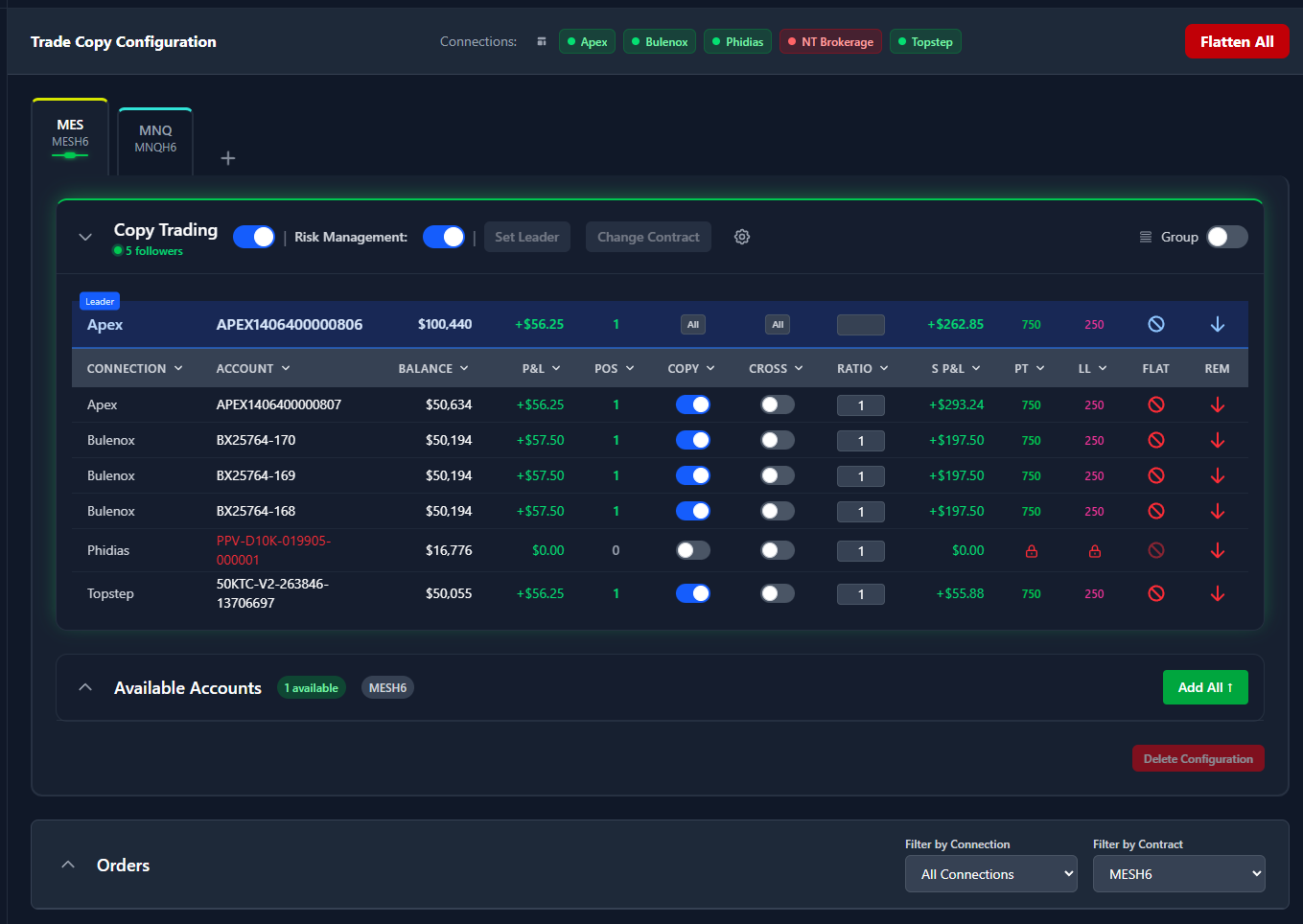 - Flatten All Button - flattens (closes) all positions and cancels all orders across ALL connected accounts.