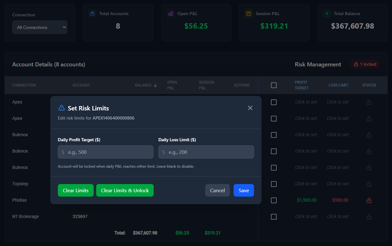 Risk Management helps protect your trading accounts by automatically stopping trading when your daily profit or loss reaches a specified threshold. When a limit is breached, the account is "locked" - all positions are flattened and no new trades can be placed until the account is unlocked.